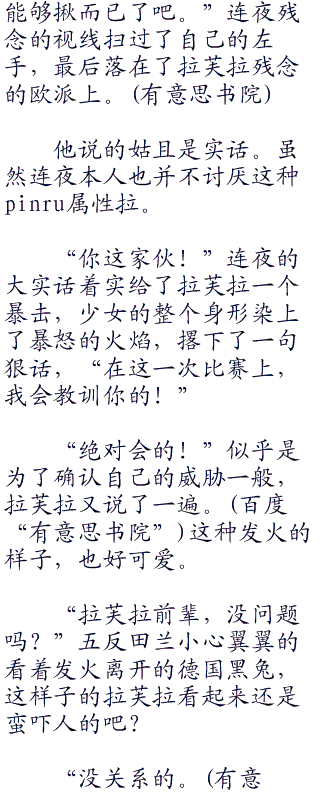 连夜看着这样子刻意摆出吓人表情的拉芙拉,感到一阵无语。虽然这家伙刚出场的时候的确颇有几分军人的铁血和森寒气质,但是在经历了一段时间的相处之后,这种形象早就‘大破’坠毁了,剩下的就只是这种反差带来的萌而已。