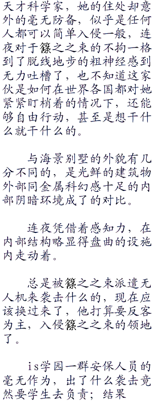 在海景别墅的内部,则是完全同休憩之地应有的景色相悖,复杂的电线路直接chanrao着奢华的大厅铺设着,休闲的日常生活设施同重金属科幻风格浓厚的全金属设施相互纠缠在了一起,让人稍微的感到了几分异常的违和感。