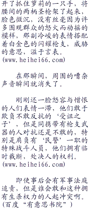 愤怒的潮汐愈演愈烈,从理论上来说,作为‘受诅之子’的少女是具有打倒周围普通人的力量的,但是,心性只不过是一个单纯无辜的小萝莉的她,怎么可能胆敢同那么多叫嚣着的中年人和年轻人对抗。