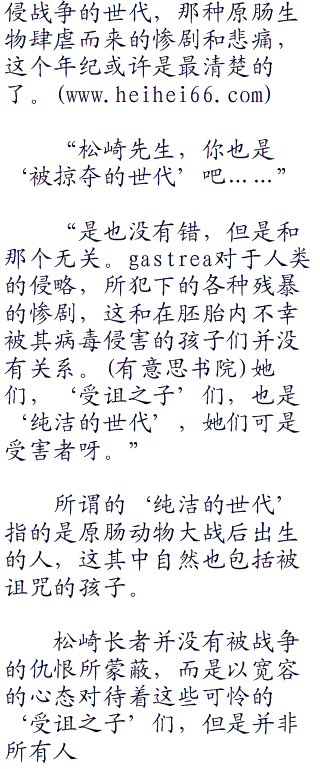 不过令人讶异的一点是,连夜并非是这个世界原本居住的土著人类,因此没有体会过原肠生物战争的恐怖和残暴,因此对‘受诅之子’们抱着更大的同情心是可以理解的,恐怕这个世界上没有人能够比连夜更加以宽容、更加不被仇恨蒙蔽的心态看待‘受诅之子’们。