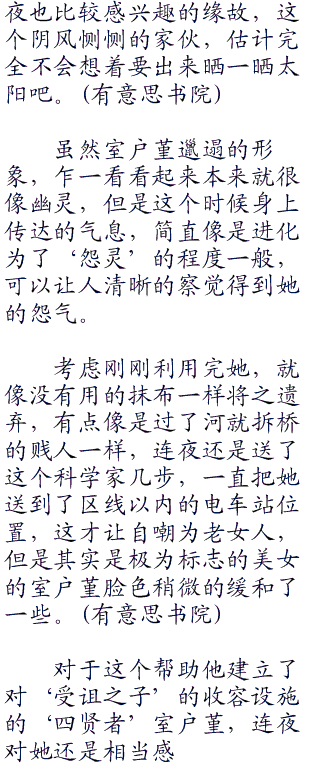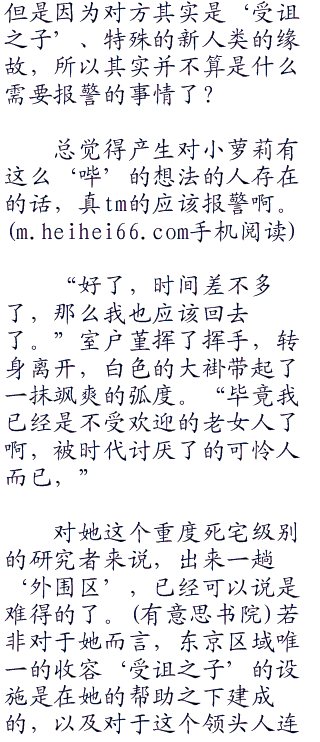 “既然如此,你就去陪‘受诅之子’她们吧。”室户堇语气里似乎带着几分怨念一般,不过以她的形象和语气,不管说什么话都是这么残念的样子啊,“借用了你这么长的时间,那群小鬼可能也会吃醋了吧。”