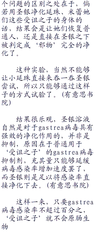 只不过从口腔进入的病毒虽然不会令人感染,虽然并不会致使立即死亡,但如果碰巧是从孕妇的口腔进入的话,在这种情况下孕妇有时会产下体内积蓄了病毒毒性的胎儿,这便是‘受诅之子’的由来。