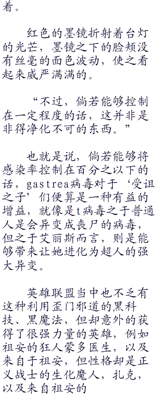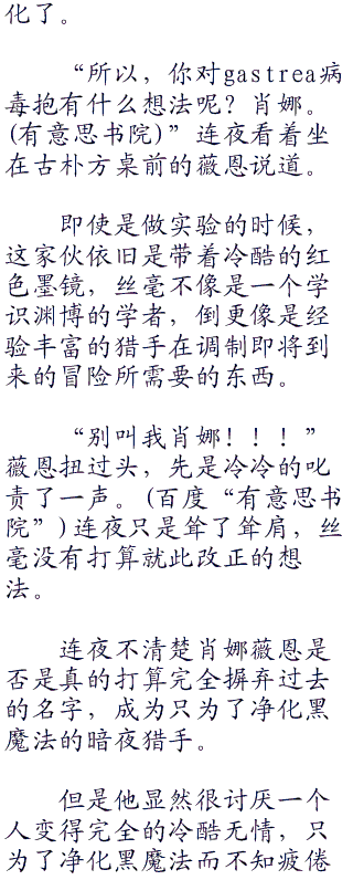因此,研究出gastrea病毒的情况,对于经常和原肠生物打交道的连夜和薇恩来说都是有必要的一件事情,当然了,本身经常和这些污秽之物打交道的薇恩是不可能感染上gastrea病毒这种东西的,而连夜很早就掌握了圣光的力量,在这种情况下,gastrea病毒自然也不可