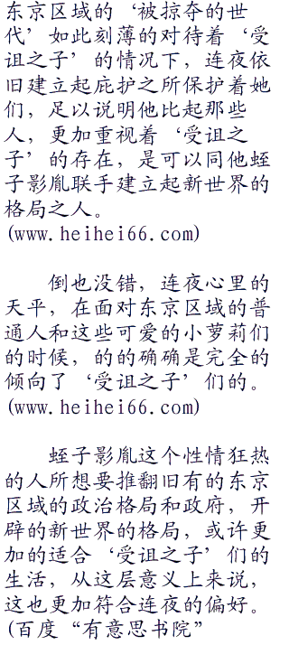 倘若说包括天童菊之丞在内的大多数‘被掠夺的世代’是极度仇恨‘受诅之子’的存在,恨不得将之消灭在视野之内,在连夜着手保护‘受诅之子’的时候,也丝毫不见得她们过上好日子,完全片面的将‘受诅之子’们视作了的怪物之子的话,那么蛭子影胤就是将‘受诅之子’看做了神明创造了的,在普通人类之上的新人类,是优胜劣汰选择之下的拥有强大力量之人。