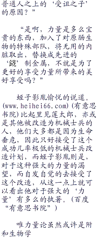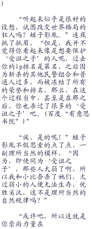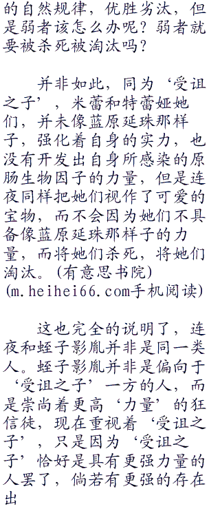 “我想,作为‘受诅之子’的庇护之人,在这些愚民的非议之下如何的举步维艰,你也很清楚吧。对于无论是心智还是力量,都在于旧人类之上的新人类,‘受诅之子’们才会是未来世界的主导力量啊。”