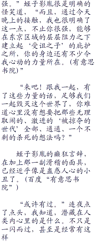 “没有啊。”小比奈摇了摇头,很难说她的眼神是否灵动过,反正从始至终,蛭子小比奈都是一副癫狂的邪笑着,既天真又邪恶,虽然有着几分病娇的可爱,但是从病娇这一点上来说,换句话说,这种笑容还是有些慑人的。