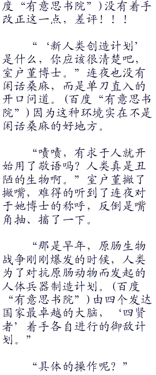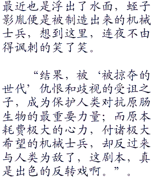 应该说,这个处于绝望的世界之下,有许许多多人被原肠生“零一零”物的恐惧阴影所蒙蔽,因此变得绝望而且神经质了一些,所以自然略显得怪异。