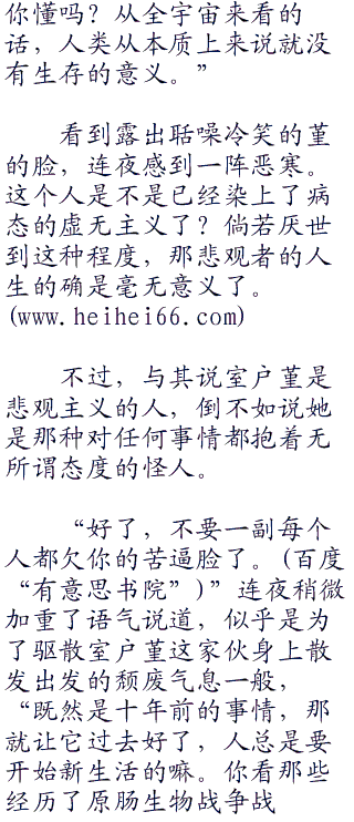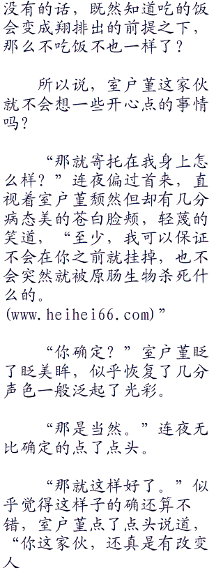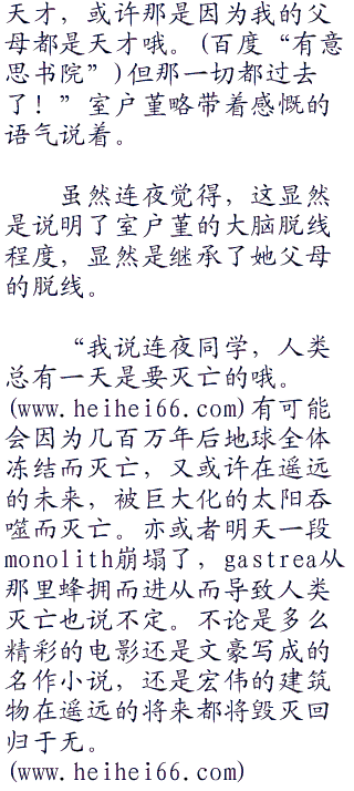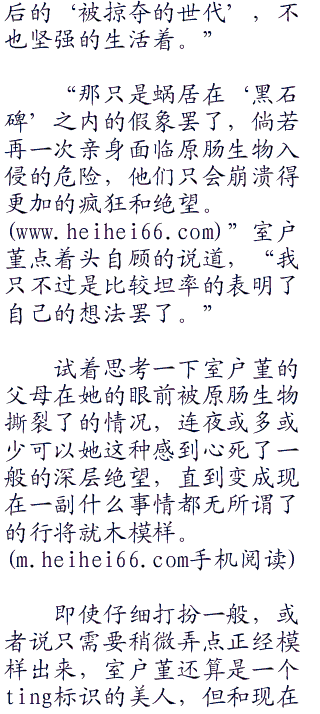 “能够干涉人体的,除了上帝,就只是魔鬼了。我就是那只魔鬼吧。”室户堇叹了口气说道,“别忘了,我可也算是‘被掠夺的世代’,对于原肠生物的仇恨是驱使我研究它们的原始动力。”