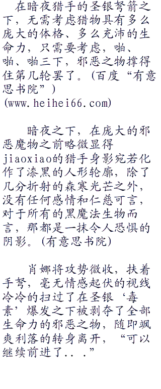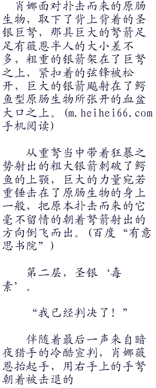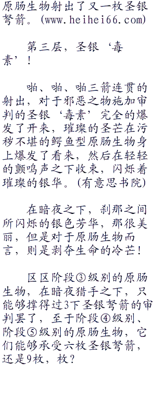 说是手弩扣弦射箭的速度太快了让它来不及扭转躯体避开呢?还是说这只原肠生物本能性的觉得这枚细小的银箭并没有躲避开来的必要。但是下一刻,肮脏的邪物就迟到了巨大的苦头。