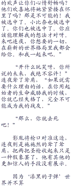 蛭子影胤满满的直起了身来,擦拭着面具之下渗透的鲜血,噙着反派特有的诡谲笑容说道,“一旦我按下这个开关还有十秒,‘錵’制铁笼内的炸弹就会定时爆炸,当然了,那个炸弹当中也参加了许多‘錵’的金属碎片,怎么样,要试一试到底是你的枪快,还是我的手速快呢?”