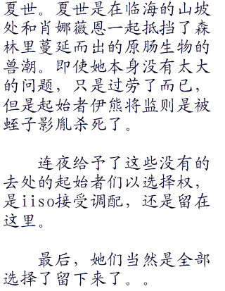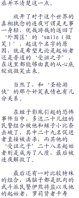 当然了,天童菊之丞委托错了对象,蛭子影胤和蛭子小比奈可不是他能够掌控的委托对象,原本他只是属意他们两装一装样子罢了,没有想到真的召来了阶段⑤的原肠生物,差点毁了整片东京区域。