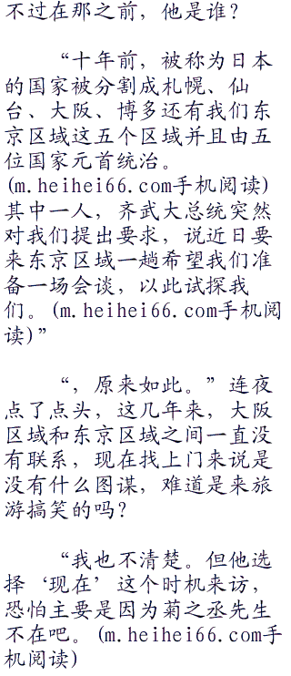 “连夜先生,大阪区域的代表齐武大总统将于后天对东京区域进行非正式访问。”