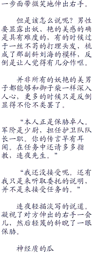 “清美小姐是第一次见他吧,这位就是击败了gastrea阶段⑤‘天蝎座’,东京区域的大英雄,‘外围区’‘sle(微笑)’结社的连夜先生。”