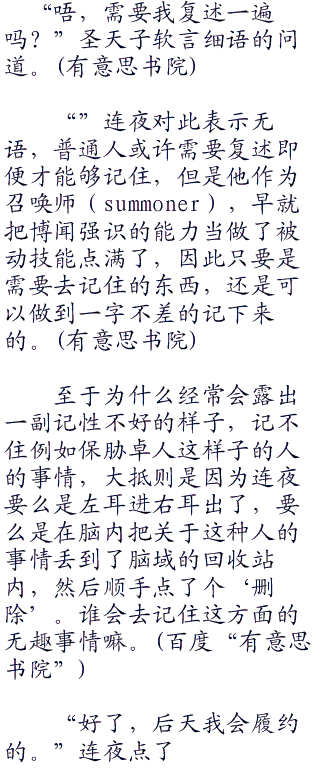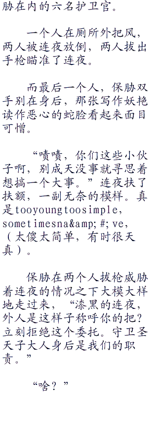 也许是察觉到气氛变得险恶,圣天子急忙过来打圆场。“保胁先生,你先退下去吧,接下去的事情就由我和连夜先生进行对话就行了。”