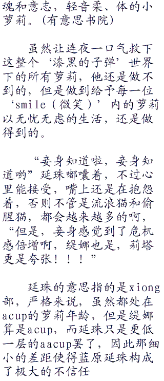 老实说,且不论‘sle(微笑)’的存在宗旨本来就是为了拯救‘受诅之子’,连夜的行为从任何方面来看都无可厚非,丝毫不能够被称为变态萝莉控,称之为绅士(hen~tai~)倒还勉勉强强能够接受,更重要的是,虽然用‘妾身’这样子的老成的说话来称呼自己,小延珠自己也只不过是不到十岁的萝莉罢了。