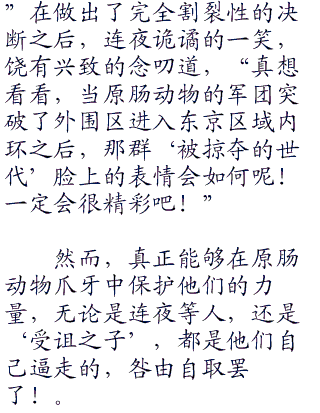 但连夜从不妥协,之所以向这些‘被掠夺的世代’给出他们想要的答案,只不过是因为他本来也就没有想让‘受诅之子’进入地下掩体避难,因为她们拥有足够的能力自保,而连夜等人也拥有足够的能力去保护她们,又何须去和东京区域牵扯上关系?