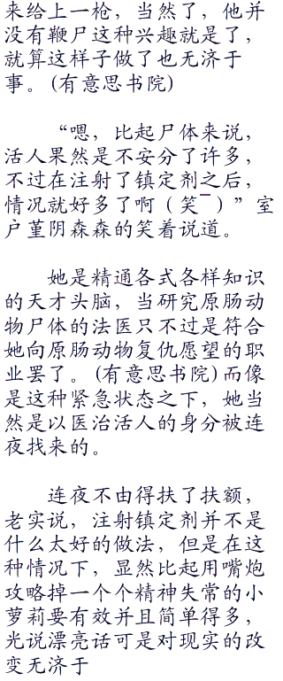 那个拖着一袭白袍的法医室户董像个没事人一般,轻轻向他举手打招呼,“嗨。因为没事做所以离开地下室。现在想想,偶尔出来一下外头也不错。”