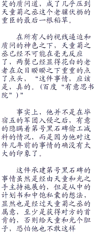 “就算上面的资料有几分添油加醋,但是天童和光大臣负责承建的第号黑石碑率先出了问题,被毕宿五盯上也是事实,就算不是因为粗糙烂制、中饱私囊的缘故,也应该引咎。”