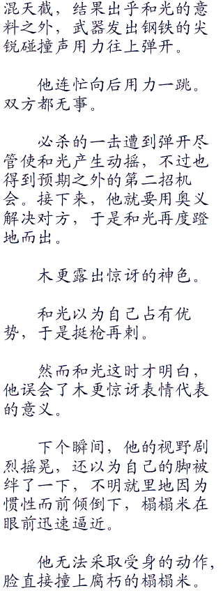 和光不得不承认,天童木更的实力,与自己在伯仲之间。至于对方实力已经在他之上了这一点,天童和光就只有在之后才能够清醒的意识到了。