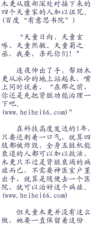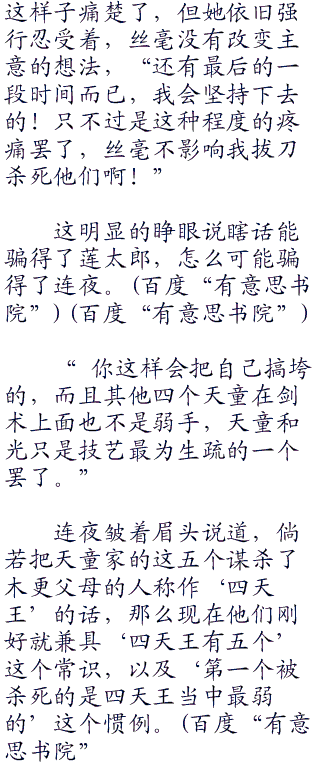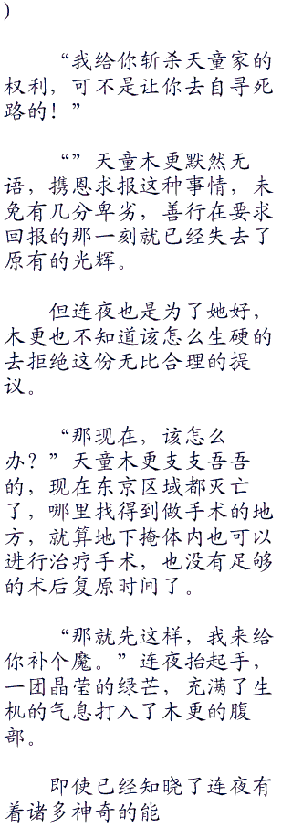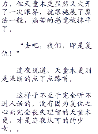 神不会显灵。恶魔也不会显灵。唯一对她施以了援手的,是连夜,让她在剑术上有了更高的造诣,更重要的是,给予她亲手作为天童家刽子手的机会。