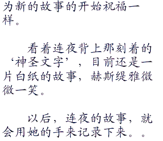紧接着后背上突然传来一阵指尖划过肌肤的轻柔触感,赫斯缇雅咬破了手指,滴下了一滴神血。