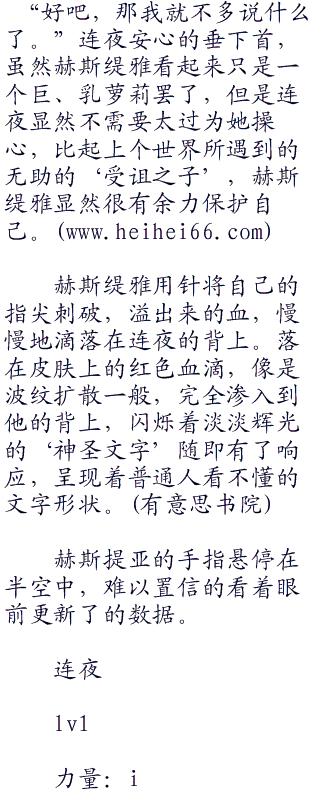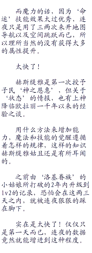 连夜将头稍微抬起,扭头看了看,虽然这并非是第一次了,但他还是不由得皱了皱眉头,“呐,赫斯缇雅,难道每一次状态更新都需要用神血辅助吗?”