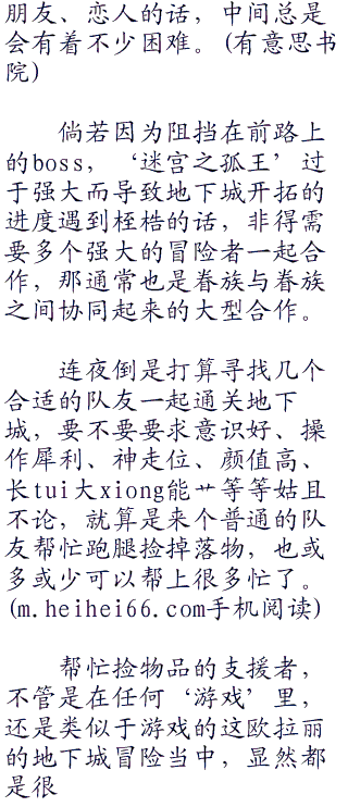 欧拉丽的地下城可很少会有‘探索第7层迷宫阶层,招收实力输出和奶妈,要求意识好、操作犀利,已有法师、刺客和盾战士,快来人开车了’这样子的大嗓门来招收队员的公屏‘喇叭’。