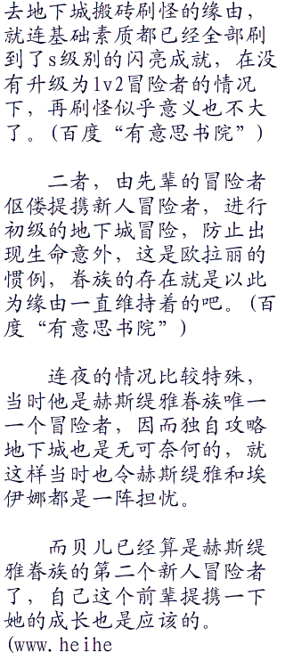 在三天的见习之后,贝儿才逐渐适应了狩猎地下城怪物的决意,并且灵活的发挥了兔子的身形矫健优势,同迷宫第一阶层以及第二阶层的哥布林和狗头人、穴居人之类的英勇的斗争着,打得有来有往的。