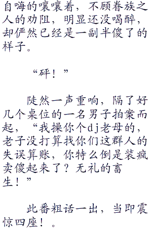 “然后我就看到那家伙,被那臭了吧唧的牛血染了全身,变成了一个赤红色的番茄一样!哈哈哈,那幅景象,简直看得笑的我肚子都疼了!”“一二零”