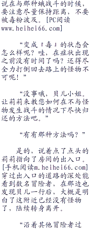 “不是这样的,您那是大意了。有◥意◥思◥书◥院贝儿小姐在今天打倒了很多的那个紫蛾,虽然攻击力不强,但其实是会散播毒鳞粉的怪物哦。虽然没有即效性,但如果多次碰到还是会产生『毒』的症状的!”