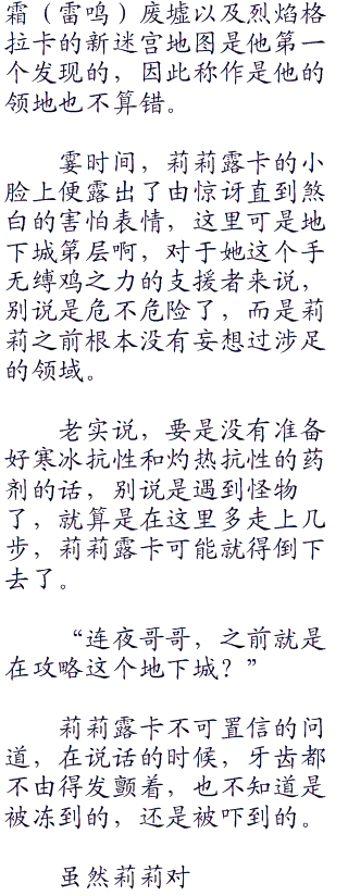 连夜和贝儿以及莉莉露卡就已经赶赴地下城。在发散着与地上出售的魔石灯相似磷光的天花板的俯视下,三人平稳地走在1阶层那真的由泥土构成的地面上。