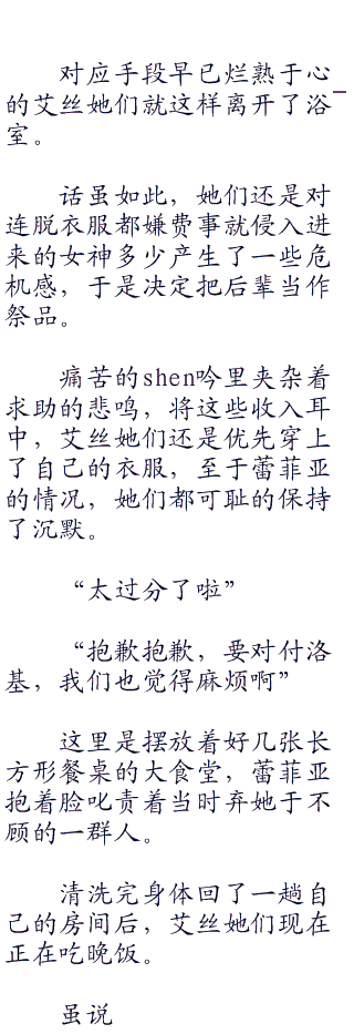 艾丝在眺望着她们互动的同时,从脚下脱去紧身裤和内~衣,自己也朝女子浴~室走去。