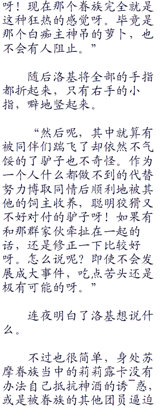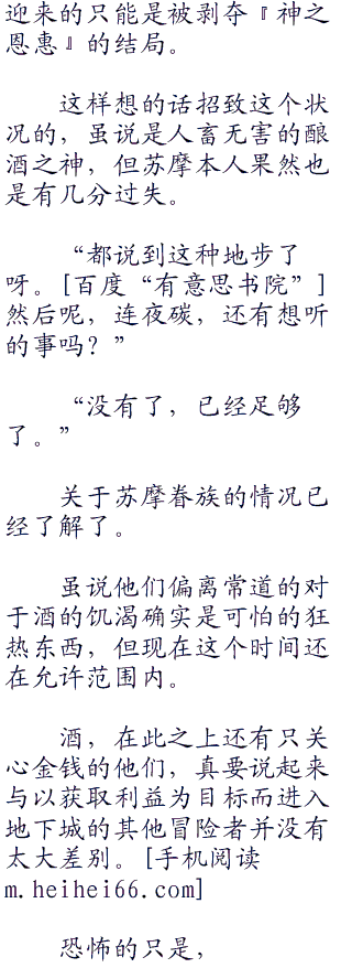 “那个白痴神是真正的变态啊。也没让持有『神秘』的团员帮忙,自己着手材料的开发与调和,接着便仅凭着制法就做出了『神酒』。已经算是将兴趣穷尽到极限的真正的白痴了,还是极致极限的啊!”