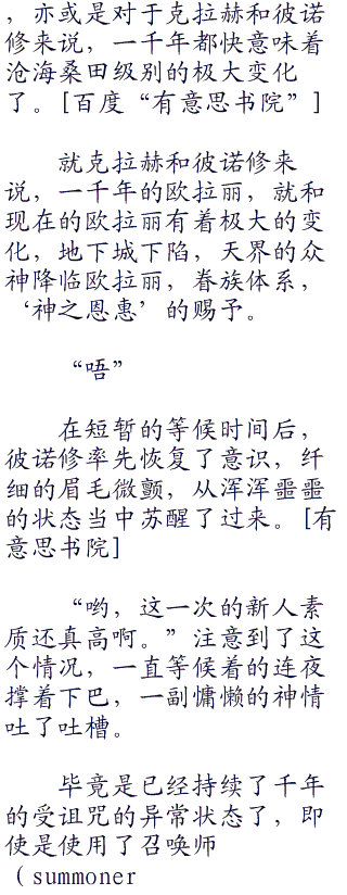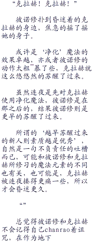 只是,彼诺修的眼神迷茫的看着克拉赫,看起来已经丧失了意识一般,但是这没有关系;因为克拉赫也感觉到自己的意识同样已经开始扭曲模糊;