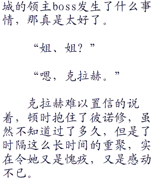 克拉赫尽力的想要告诉姐姐,自己对她的歉意,思念,以及“让我们从新做好姐妹吧”,这样子的话语。