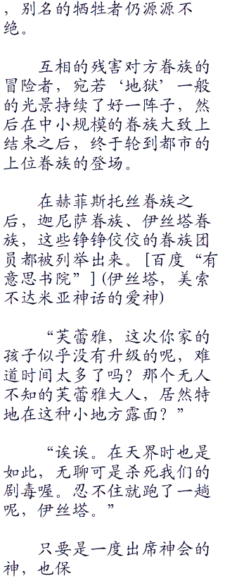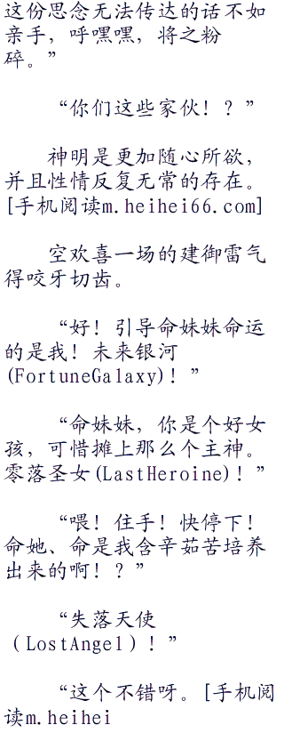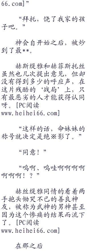 率领着上位眷族高格的主神们,似乎把神会的前辈身分视为绝佳的好事,趁此机会开始恶整新人。惨叫着接连崩溃的神们,以及,咯咯发出高笑的神们。看着两个极端的阵营,赫丝缇雅只能不堪的背过脸庞。