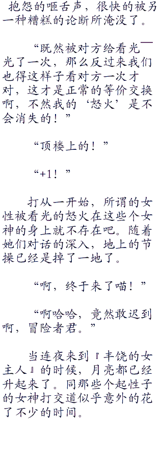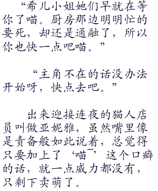 今夜有一个在酒场‘丰饶的女主人’参加聚会的预定,似乎是一瞬间在欧拉丽大街小巷里传达开来的‘神会’的消息,被希儿等人知道了,结果就变成了要在『丰饶的女主人』开庆祝会了。