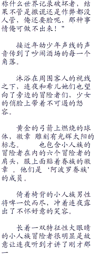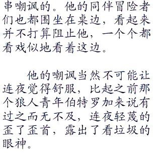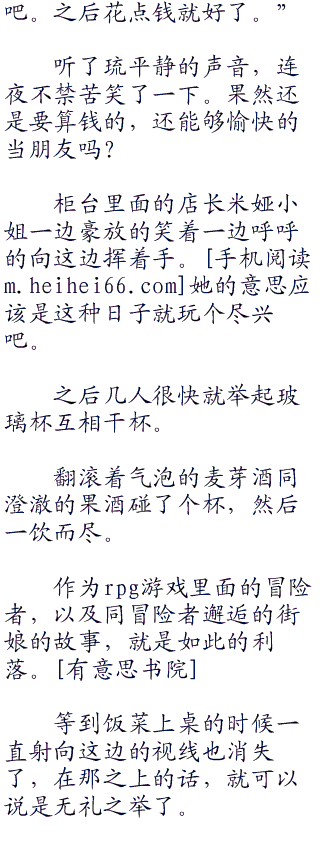 连夜擦拭了一下额角并不存在的冷汗,从容的走进了酒场。准备好的桌子就在酒场柜台角落的特等席附近。桌旁除了坐着希儿和琉,似乎是时间紧迫的缘故,她们还穿着店员的服装。