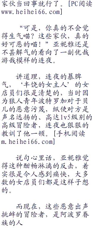 猫人少女亚妮雅率性的性格比较容易受到挑拨,听到这种无理取闹的议论声忍不住站起来想要反驳,不过却被希儿按了下来。有 意思\书 院。 ww w .hei.co br />