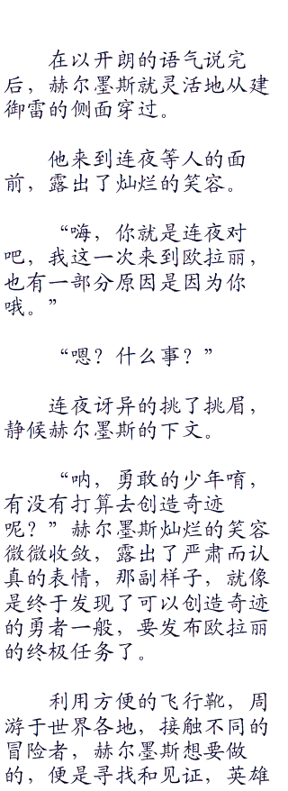 日落西山,外面已经被夜色笼罩。会场设施地处北之主街区边界,不知是不是因为建在高级住宅区中间的缘故,这里距离酒场或是人潮涌动的夜之喧嚣很是遥远,甚至安静到了让人怀疑这里当真地处欧拉丽的程度。