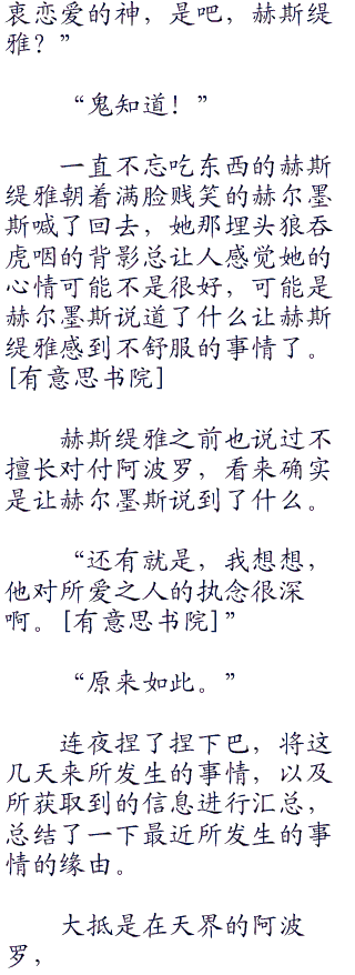 “他一直是个有意思的家伙喔,我和阿波罗在天界时就已经有往来,他总是让我惊喜不断,还经常被其他神当成笑料。”