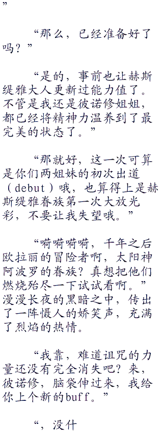 虽然作为守城的立场还是姑且进行了防御攻击的准备,但己方的胜利早已是板上钉钉的事了,充其量只是彻底不彻底的问题。对手的团员数貌似临时有所增加,然而雅辛托斯听说还是不足五人。他们不可能对付得了这城里的数百名守军。
