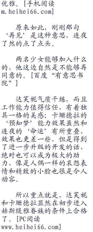 卡珊德拉则腼腆地向连夜微笑,再度低头道谢。很快她也追在达芙妮的身后离开了。