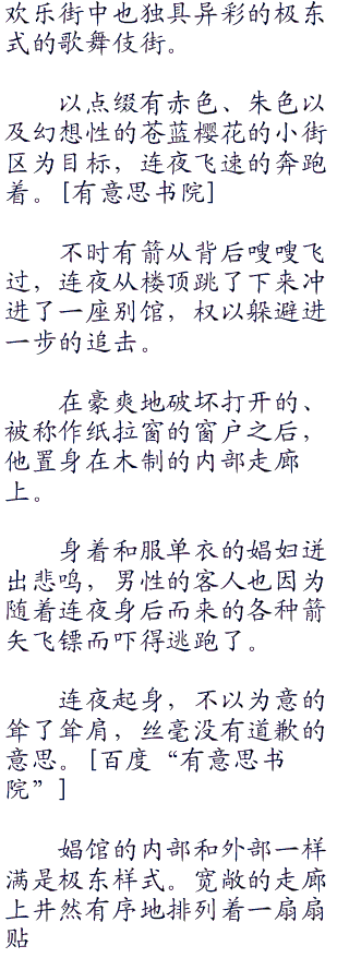 在娼馆的上层探出脸的娼妇们看着连夜的身影,扯着嗓门呼喊道。