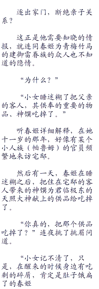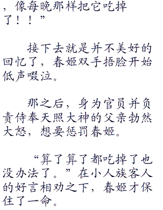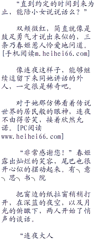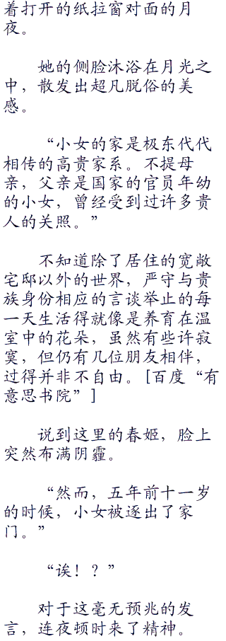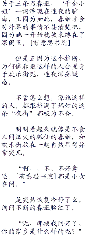 “是的,您不妨把这当做仅限一夜的邂逅就罢了,春姬会一直铭记连夜大人的恩惠,希望大人就此忘了小女吧。”