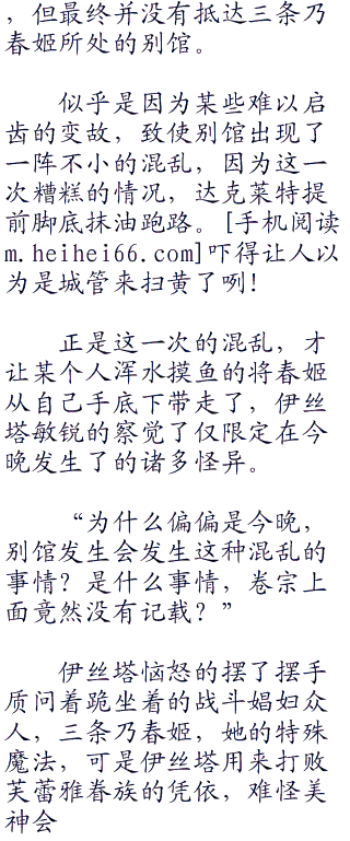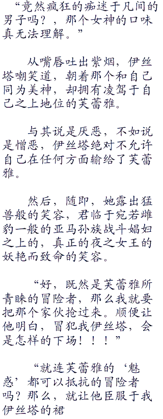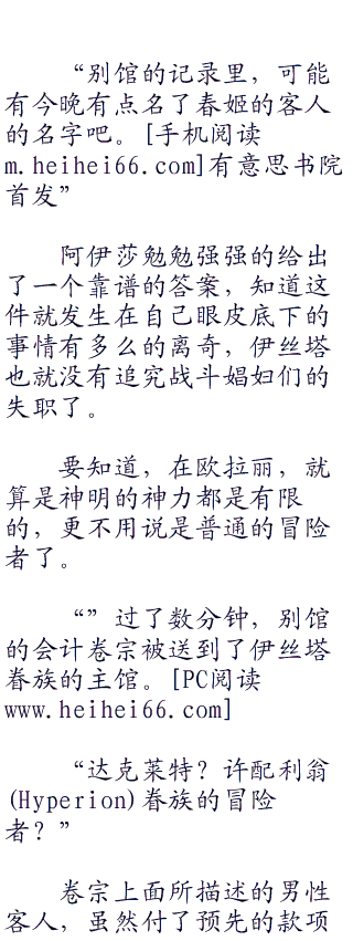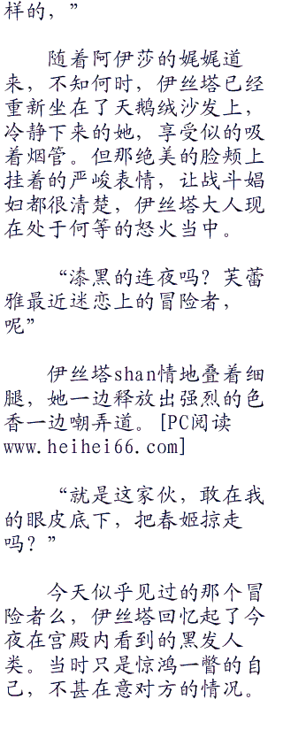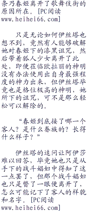 虽然她并不知道伊丝塔为何突然问起三条乃春姬区区一位见习娼妇的情况,也不知道春姬是哪里开了窍,终于开始接客了,但既然是女神的问题,那么阿伊莎也唯有予以明确答复的责任罢了。