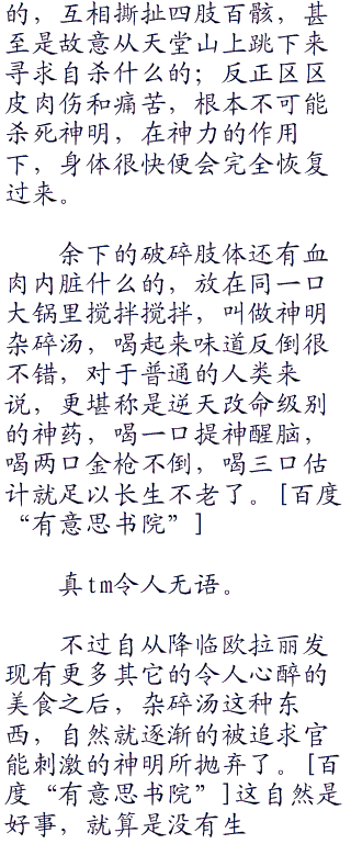 道理很简单,作为活了一亿年以上(至少设定上是这样的)的神明,她们的想法肯定和常人已然完全不在同一条回路上了,伴随着悠久时间的流逝而逐渐钝感下来的思想,无作为的常态,直至变得毫不自爱,节操突破下限极深的神明有不少,这是永生