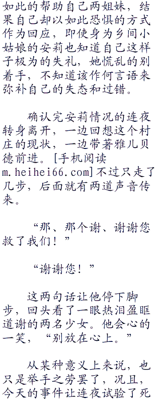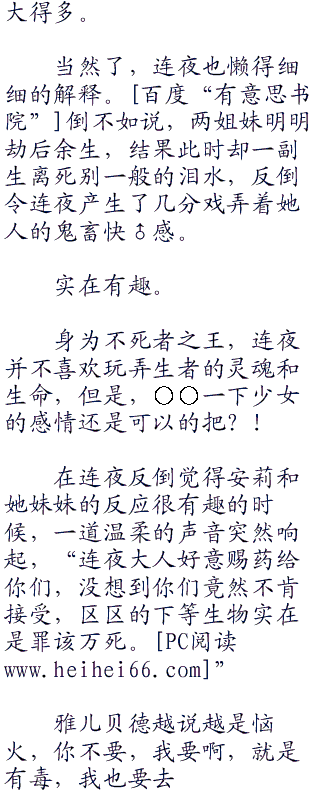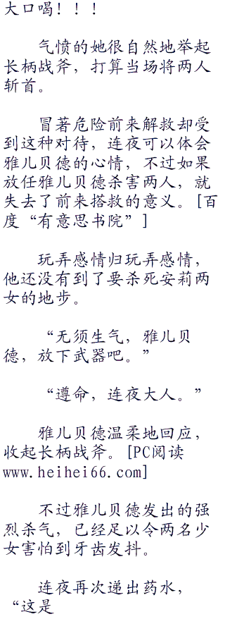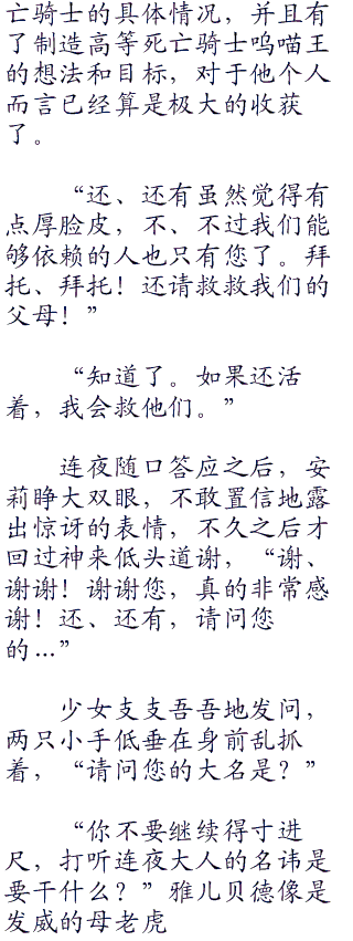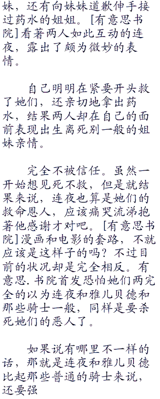 虽然理解此时自己在两女眼前无异于是大魔头,但如果让和安莉两女同为女性的雅儿贝德来处理的话,恐怕只会造成更糟糕的后果,因此连夜决定继续表达善意,安抚几乎吓坏了的安莉两女。有◎意◎思◎书◎院