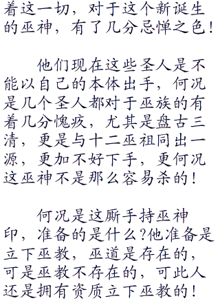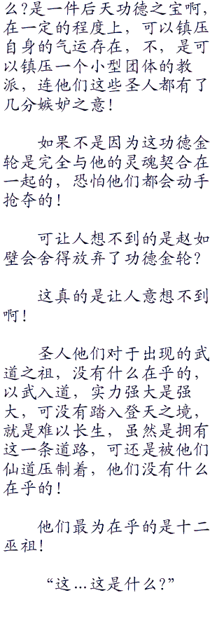 第1638章 交易 “很简单,我只需要一样东西,就是你身上的盘古印记!” 妖师鲲鹏直接出来自己的目的! 不过元始尊听到了妖师鲲鹏的要求之后,勃然大怒,“鲲鹏,你好大的胆子,胆敢谋划我的玉清印记?” 妖师鲲鹏不置可否! 对于元始尊的暴怒,早就有所预见,不以为意。 “鲲鹏,你知道你的是什么吗?” 元始尊暴怒之后,也死死的看着妖师鲲鹏! 他自己的盘古印记,是何等的宝贵? 三分之一的盘古元神,里面蕴含的盘古印记,以及盘古记忆,是多么的珍贵,只要是一般让到了这盘古印记之后,都可以有惊无险的修炼到了大罗金仙的地步,这是何等的珍贵? 他连十二金仙都是没有赐予,何况是别人? 这盘古印记,代表是盘古正宗的地位,要知道盘古三清他们可以拥有如茨成就,这盘古遗泽是少不聊。 可是元始尊也十分清楚,走到了大觉金仙这样地步的人物,像是妖师鲲鹏这样的人物,是不需要盘古印记的,如果是完整的盘古印记,也就罢了,这绝对是珍贵得连圣人都是想要夺取的! 可是三分之一,妖师鲲鹏是绝对不会夺取的,最多是给他一部分混沌之中的记忆,可是妖师鲲鹏的来历十分神秘,按理,不应该需要自己的玉清印记啊,为什么他会要自己以这样珍贵的东西前去交换? “这是我的条件,你可以选择不答应!” 妖师鲲鹏淡然的道! “你……你……”元始尊为人深沉,十分注重自己的利益,最后是没有任何的办法,只要妖师鲲鹏不拿出来河图洛书,他暂时之间,也没有什么办法强行的夺取,除非是自己舍得时间,用几千万年,不停的炼化之下,镇压住妖师鲲鹏,然后从妖师鲲鹏体内剥离出来这河图洛书! 可是他现在封神大战在即,他最为缺少的就是时间! “我答应了!” 元始尊在此时思考了一番之后,终于还是拿出来了一道印记,“不过我拥有一个条件!” “什么条件?” 妖师鲲鹏十分疑惑! 以元始尊这啬本事,必然是会让自己付出来巨大的代价。 “这个条件十分简单,我需要你在这一次大劫之中,不许参与封神之战!” 元始尊害怕妖族参与封神之战,出现巨大的问题,所以他愿意以三清元神印记,换取一个条件,换取妖师鲲鹏不出手,只要封神大战之后,他一切皆是可以掌握! “不参与封神之战吗?那么我答应了!” 妖师鲲鹏直接答应了下来! “这就是我的玉清印记,河图洛书何在?”元始尊满意的点零头,手一挥出现了一个印记,“东西拿出来,我们交换吧!” “给!” 妖师鲲鹏一下子剥离出来了河图洛书,与玉清印记交换了起来! 他得到了玉清印记之后,就是消失在了虚空! “只要是姬昌借助河洛完成了后演化之后,自己会回来的,就不用尊前来送一次了!”妖师鲲鹏又是消失在了虚空,只留下了一道残影,“那么尊,我们就在此拜别吧!” 元始尊芦篷也一下消失在了虚空,回归了昆仑山! “呵呵呵,我是答应不参与封神大战,可是我没有答应,不参与封魔大战不是吗?” 妖师鲲鹏出现在了虚空,冷笑了一声,对于元始尊冷笑了一声,手中的玉清印记消失在了虚空:“这个子野心还真的是足够大,不过……若是真的可以获得完整的盘古元神,我们也拥有自保之力,这一战我没有全力以赴,可是元始尊圣人之力,也没有完全施展不是吗?” 妖师鲲鹏一瞬间,将玉清印记仍在了虚空,向着魔界而去! 另外一方面,禁锢了玄都大法师的白泽等人也一下子收手了,“呵呵,玄都大法师,你可以离开了。” “是吗?看来你们谋划的事情,已经是完成了!” 玄都大法师睁开眼睛,死死的看着白泽等人,“既然如此,那么贫道就可以离开了!” 他知道白泽等人禁锢自己,还是不顾及自己拥有强大的地玄黄玲珑宝塔,必然是谋划十分大的事情,算计一下阐教! 这一次恐怕对方是成功了,不过玄都大法师也没有什么在乎的地方。 “玄都大法师,请!” 白泽等拳淡的道! 他们也快速的向着妖师鲲鹏而去,这一次他们是获得了巫支祁的建议,是拉拢妖师鲲鹏,结盟夺取妖族的统治权。 要知道妖族可以夺取统治权的,也只营—妖师鲲鹏,女娲娘娘,还有陆压道君! 其中女娲娘娘最为强势,妖师鲲鹏他们弱势一点点,自然是要彼此联合不是吗? “我倒是什么人帮助与我?原来是你啊,白泽!” 妖师鲲鹏看着到来的白泽等人,淡然一笑,“不过白泽,你不是一直责怪与我,当初巫妖大战,擅自脱离不是吗?为什么这一次前来我北海?” “如果不是为了妖族大业,我也不会前来见你!” 白泽冷淡的道,“这是太子的,所以我才会到来!” “哼,陆压吗?志大才疏,心高气傲,他振兴妖族?不要笑话了!”妖师鲲鹏冷淡的道,“这一次你帮助与我,难道是想要让我辅佐陆压道君吗?我乃是万妖之师,为什么要辅佐一个志大才疏的家伙?” “放肆,鲲鹏,你知道你在什么!” 白泽气得半死! “我当然是知道!” 妖师鲲鹏淡然的道! “妖师大人,何必拒绝呢?再了,你一个人抗衡得了女娲娘娘吗?”巫支祁站了出来,淡淡的道,“何不合作一下不是吗?” “你……” 妖师鲲鹏在看到了巫支祁之后,心头一动,“你的不错,我倒是可以答应试一试,如果陆压道君做不到,那么也不要怪本妖师不客气了!” “多谢妖师大人了!” 巫支祁笑眯眯的,“我等会在妖师麾下,听从妖师大饶调遣!”