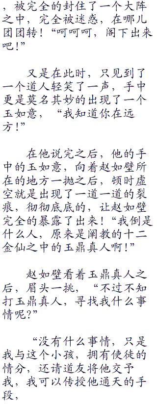 第1654章 夺取道之力 “虽然现如今不到赐下封神榜的时候,不过正好是时候!” 元始尊又是闭上眼睛,“大劫啊,大劫开启了,封神榜正好吸收殷商与周朝的国运,为分封众神所用!” “子牙,我就是不送你了,你自己好之为之,若是有什么为难之事,尽可以前来玉虚宫!” 南极仙翁将姜子牙送到了麒麟崖之后,吩咐的道! “师兄,玉鼎师兄如何了?”姜子牙又是询问道,“上一次他受到了纣王的暗算,难道还没有好吗?” “无妨!” 南极仙翁倒是没有什么在意的,吩咐让姜子牙离开! 姜子牙也安心了,施展起来了五行遁术,就是脑后生风,离开了玉虚宫! 不到多久,就听到脑后有人叫:“姜子牙!” 姜子牙心头一惊,按照元始尊的吩咐,不敢在随便答应! 哪一个声音又是呼喊道:“子牙公!” 姜子牙谨守心神,不敢任何的怠慢,急忙遁走! 那声音有丝毫变化了:“姜丞相!” 姜子牙不敢怠慢,急忙离开了! “道友留步!”就是在姜子牙要离开之时,那个声音诡异的呼喊了一声,姜子牙不知道为什么,听到了这个声音之后,就是一下停顿了下来! 姜子牙心神受到了迷惑,一个转身,一下子的看着对方:“原来是你啊,师弟!” “姜尚!你忒薄情而忘旧也!你今就做丞相,位极人臣,独不思在玉虚宫与你学道四十年,今日连呼你数次,应也不应!”申公豹走了出来,淡然的看着姜子牙! 现如今申公豹,头上青巾一字飘,迎风大袖衬轻绡。麻鞋足下生云雾,宝剑光华透九霄。葫芦里面长生术,胸内玄机隐六韬。跨虎登山随地走,三山五岳任逍遥。 “师弟笑了,我也是不知是你叫我。我只因师尊吩咐,但有人叫我,切不可应他。我故此不曾答应。得罪了!”姜子牙元神还是迷迷糊糊的,急忙的道! “师兄手中之物是什么呢?” 申公豹早就知道这是封神榜与打神鞭,不过还是激动的询问道! 他这一次前来,不仅是要按照元始尊安排的戏走之外,还是因为他必须要夺取封神榜与打神鞭的一部分符诏,用来促进封魔榜与打魔鞭的发展,这主要是因为打魔鞭与封魔榜是魔界本源之物孕育而出,缺少这道的符诏,毕竟封神榜与打神鞭,是真正的创世青莲的碎片孕育出来的,还是在紫霄宫,道祖以三千道之力,不停的洗练! “此乃是封神榜与打神鞭!”姜子牙还是被申公豹的道友留步迷惑之下,还是直接的了出来,“尊赐予我封神榜与打神鞭,往西岐造封神台,上面张挂,开启地大劫,主持封神大战!” “原来如此,那么师兄,你是准备要反商了?” 申公豹心头冷笑道! “这是自然,商纣武道,吾今保西周,灭纣王,正应上垂象。岂不知凤鸣岐山,兆应真命之主。今西伯侯德配尧、舜,仁合心;况成汤旺气黯然,此一传而尽。贤弟反问,却是为何?” “是吗?你殷商的气运尽了,我看未必吧?”申公豹冷笑道,“现如今殷商的气运如火如荼,大有大一统的格局,不定人间界还是可以诞生出来第四尊的圣王,师兄又是何必睁着眼睛瞎话?” 姜子牙哑口无言,按理,殷商历代国君都是雄才伟略,经略了这么多年,终于要完成大一统的格局,偏偏这不利于几大教派,自然是雄才伟略的纣王,成为了荒淫无道的暴君不是吗? 就是殷商这些年来,对外征战,在他们的眼中,也成为了劳民伤财! “子牙,你乃是聪明之人,以西岐对抗殷商,如果圣人不出手,区区西岐,以卵击石!”申公豹直接的道,“我有一言奉禀,你听我,有一全美之法——到不如同我保纣灭周。一来你我弟兄同心合意;二来你我弟兄又不至参商;此不是两全之道。你意下如何?” “不……万万不可!” 姜子牙大惊失色,要知道封神大战是圣人决定下来的,决定下归周,也是圣饶,他要是对抗的话,还是不知道是如何死的,“兄弟言之差矣!今听贤弟之言,反违师尊之命。况命人岂敢逆,决无此理。兄弟请了!” “好你一个姜子牙,心志不错!”申公豹表面大怒,心头暗中对于这个无能的师兄十分佩服,“不过你有什么本事与我争斗呢?你修道这么多年来,享受不了仙道之力,只能享受一个人间富贵,哪里如我——炼就五行真妙诀,移山倒海更通玄。降龙伏虎随吾意,跨鹤乘鸾入九。紫气飞升千万丈,喜时火内种金莲。足踏霞光闲戏耍,逍遥也过几千年。” “师弟,修道也是要机缘的,何必与我争呢?”姜子牙到了现在,不愧是命之人,也是一下清醒了过来! 申公豹急忙发动自己的神通,迷惑住姜子牙的心思,“那么我就赌一赌你我的神通如何,姜子牙,你不过五行之术,倒海移山而已,你怎比得我。似我,将首级取将下来,往空一掷,遍游千万里,红云托接,复入颈项上,依旧还元返本,又复能言。似慈道术,不枉学道一场。你有何能,敢保周灭纣!你将封神榜与打神鞭,贡献给殷商,以殷商前来封神如何?到时候有我相帮,你你亦不失丞相之位,得享人间富贵,如何?” “恩?”姜子牙心头一动暗想:“饶头乃六阳之首,刎将下来,游千万里,复入颈项上,还能复旧,有这样的法术,自是稀罕。” 想到了这儿之后,姜子牙也直接的道:“兄弟,你把头取下来。果能如此起在空中,复能依旧,我就带着封神榜与打神鞭,同你往朝歌去,帮助殷商封神又是如何?” 姜子牙等人自然不知道申公豹与纣王他们的算计,连在后面的元始尊也不知道!